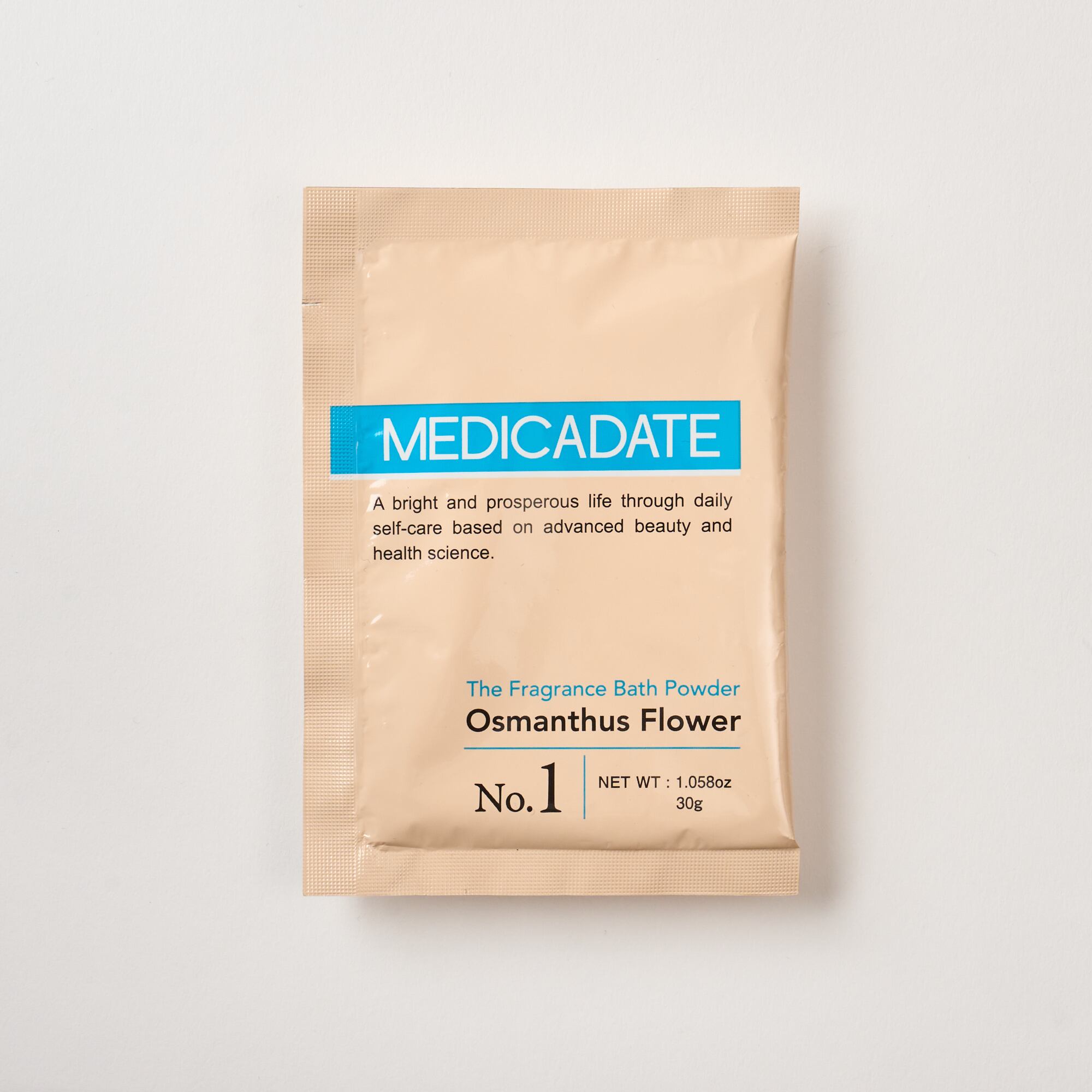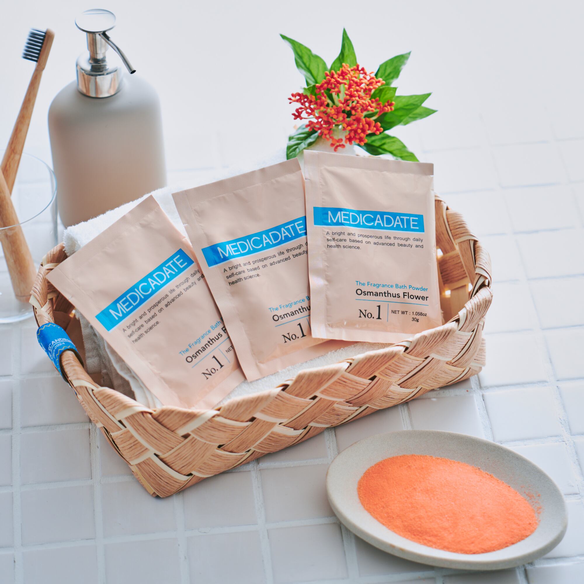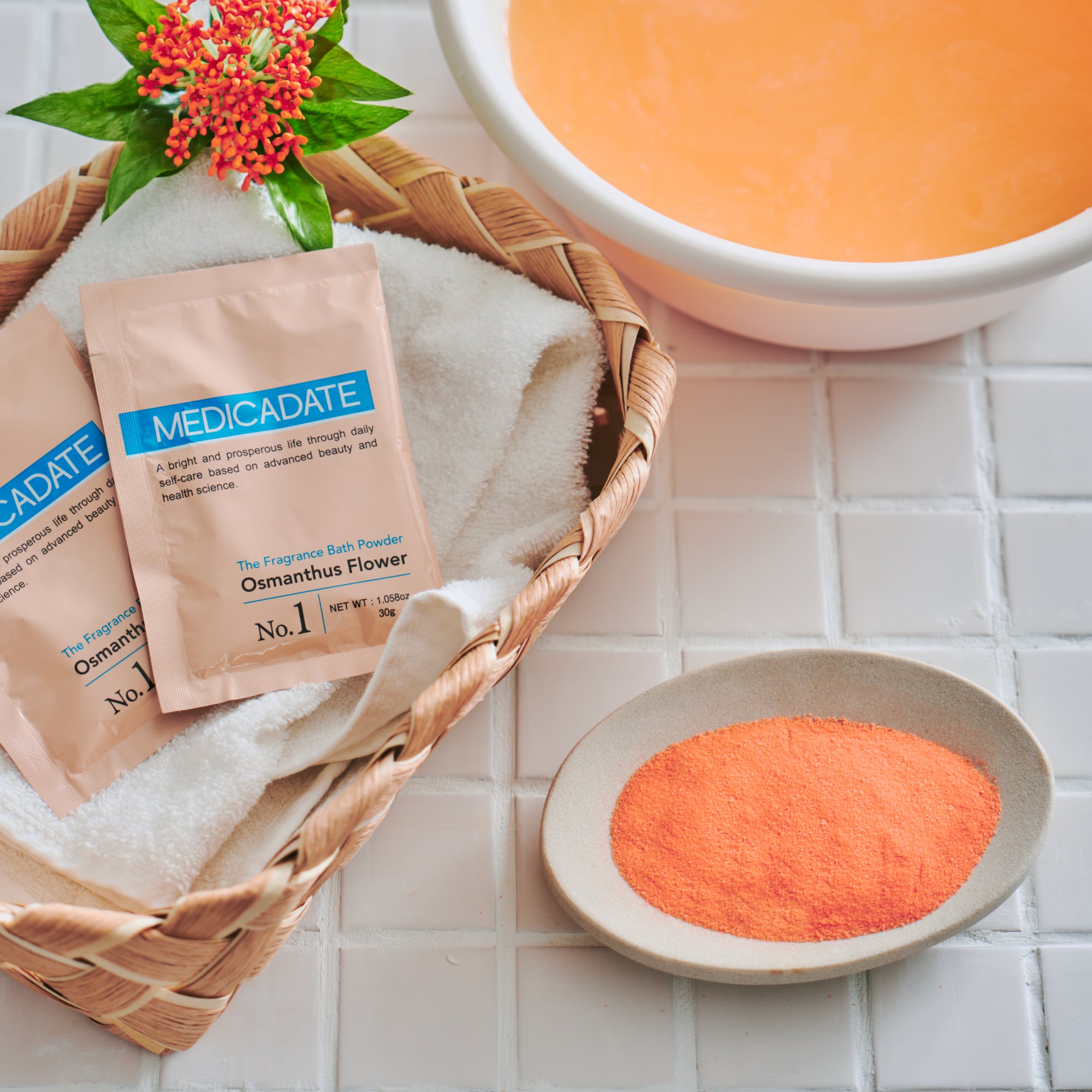 MEDICADATEのザ フレグランス バスパウダーは、疲労回復、肩こり、腰痛、リウマチ、冷え症など17もの効能効果が認められたスキンケアも可能な薬用入浴剤です。心地よい金木犀の香りのバスタイム、上質な癒しのひとときを。